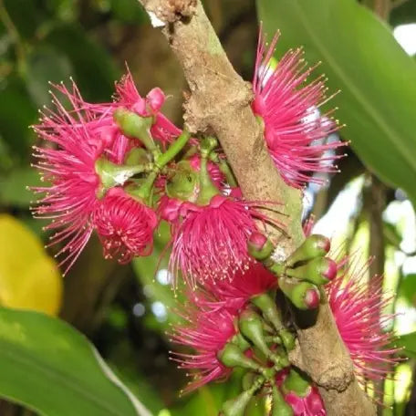 Syzygium jambos perennial evergreen plant, grown for the edible fruits in taste that remind roses and also used as ornamental for the flowers and the fragrant of the fruits. Fruit edible color is red the structure is oval with crown in top.